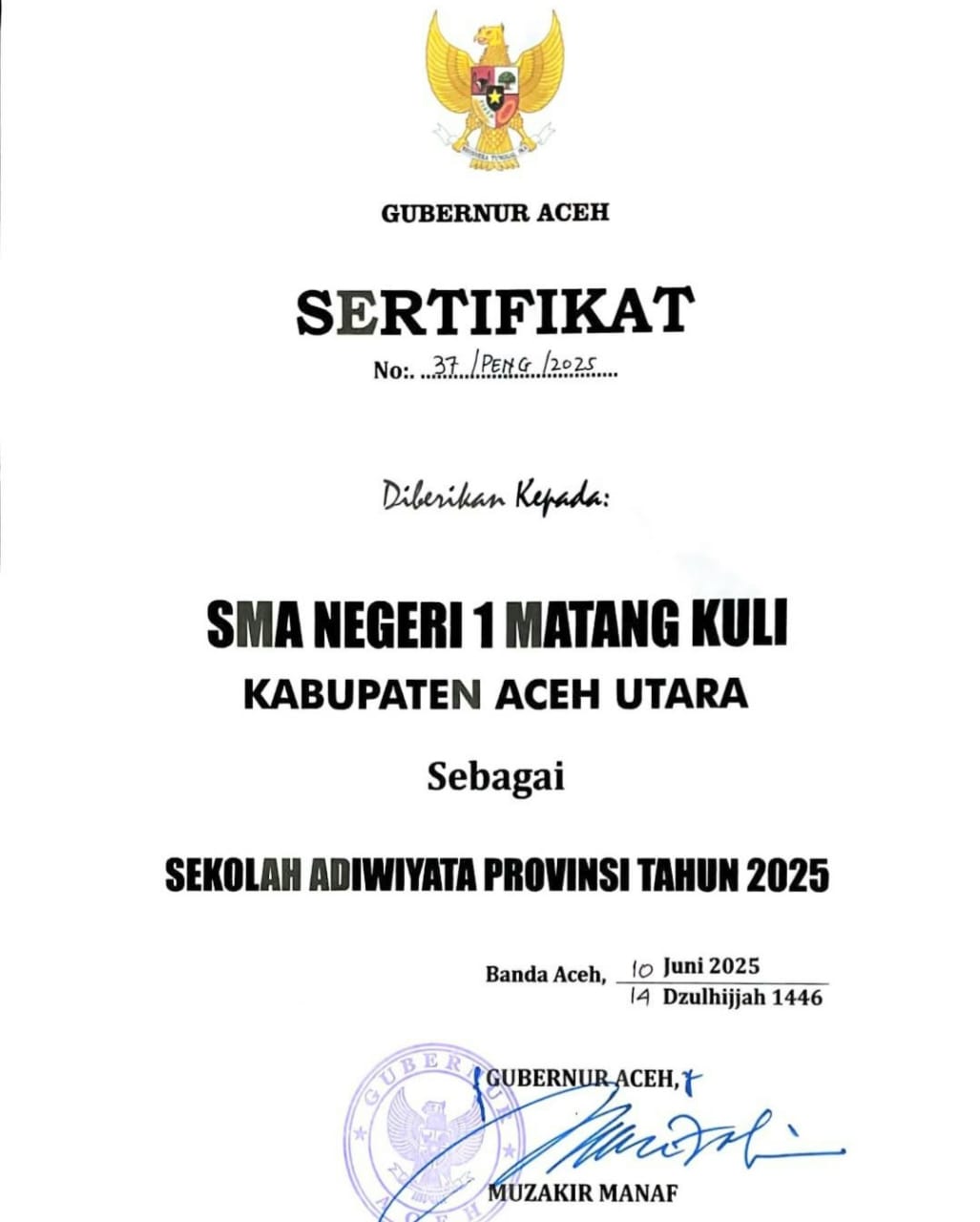 “Dengan demikian, SMA Negeri 1 Matangkuli menyandang Sekolah Adiwiyata Provinsi Aceh,” ujarnya.