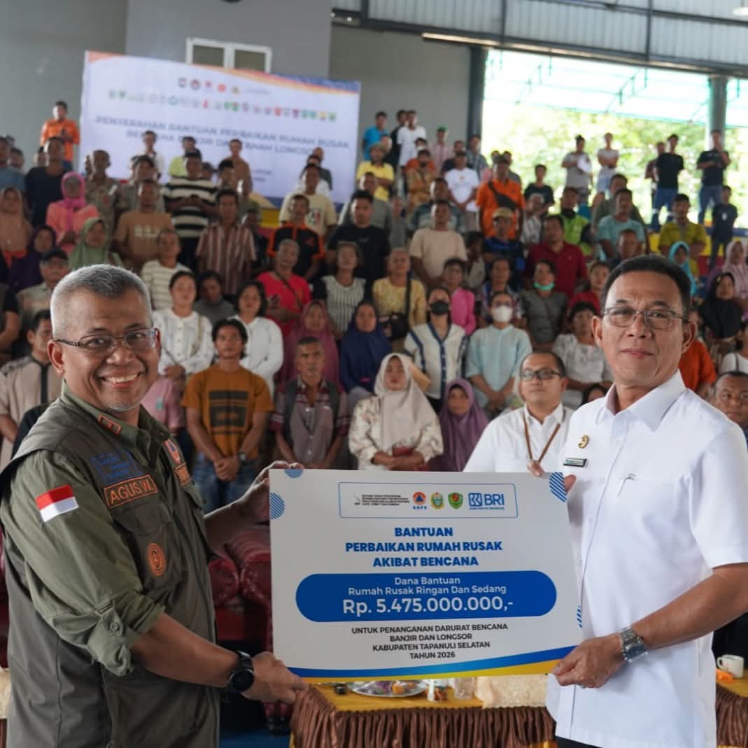 TAPSEL (Waspada.id): Pemerintah pusat melalui Badan Nasional Penaggulangan Bencana (BNPB) menyalurkan stimulan bantuan perbaikan rumah rusak ringan dan rumah rusak sedang ke Kabupaten Tapanuli Selatan, Jumat (13/2/2026).
