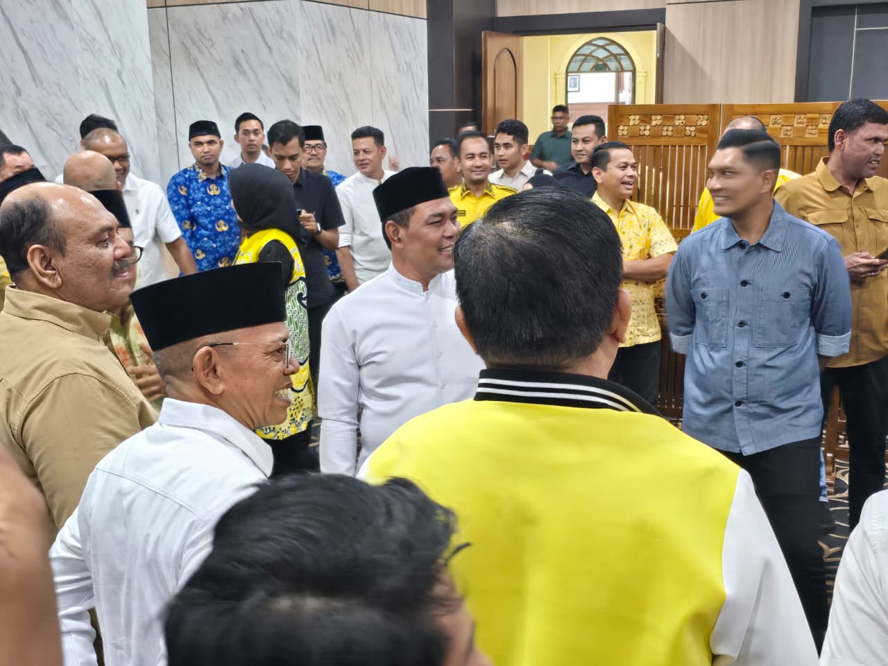 Bupati Aceh Besar, Muharram Idris, berdiskusi dengan anggota Badan Legislasi (Baleg) DPR RI saat mendampingi kepulangan rombongan usai kunjungan kerja di Provinsi Aceh melalui Bandara Sultan Iskandar Muda, Blang Bintang, Aceh Besar, Jumat (17/4/2026). Waspada.id/Ist