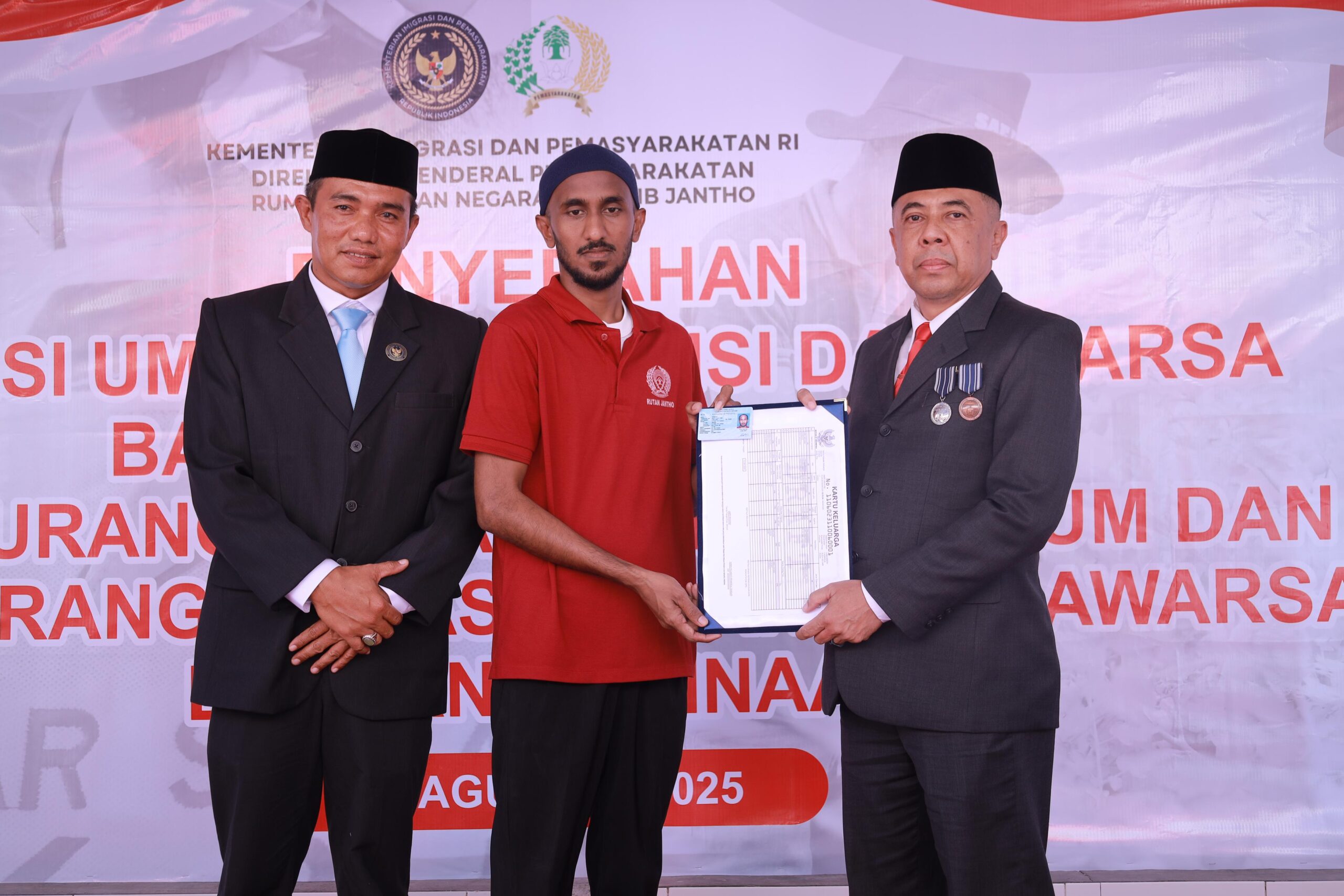 KOTA JANTHO (Waspada.id): Bupati Aceh Besar H Muharram Idris atau yang akrab disapa Syech Muharram, menyerahkan Surat Keputusan (SK) remisi bebas kepada empat orang Warga Binaan Pemasyarakatan (WBP) setelah memperoleh Remisi Dasawarsa II, dalam rangka peringatan HUT ke-80 Kemerdekaan Republik Indonesia, di Rutan Kelas II B Jantho, Aceh Besar, Minggu (17/8).