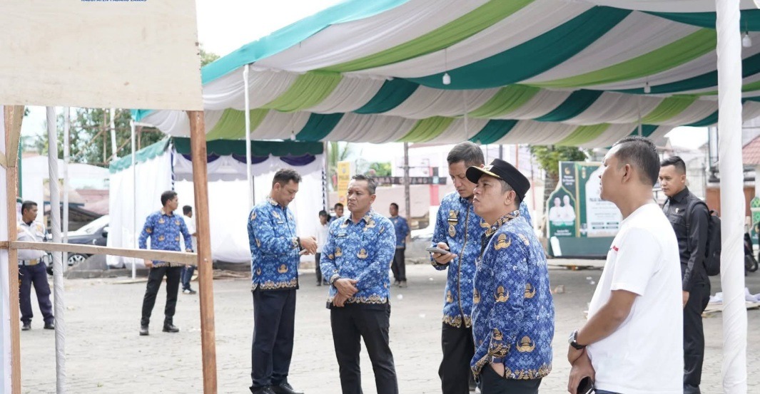BARUMUN (Waspada.id): Bupati Padanglawas Putra Mahkota Alam Hasibuan SE beserta Wakil Bupati H. Achmad Fauzan Nasution, S.H.I., M.Pd.I melakukan peninjauan langsung terhadap persiapan pembangunan stand dan penataan lokasi Ramadhan Fair 1447 H/2026 M di depan Lapangan Polsek Barumun, Rabu (18/02/2026).