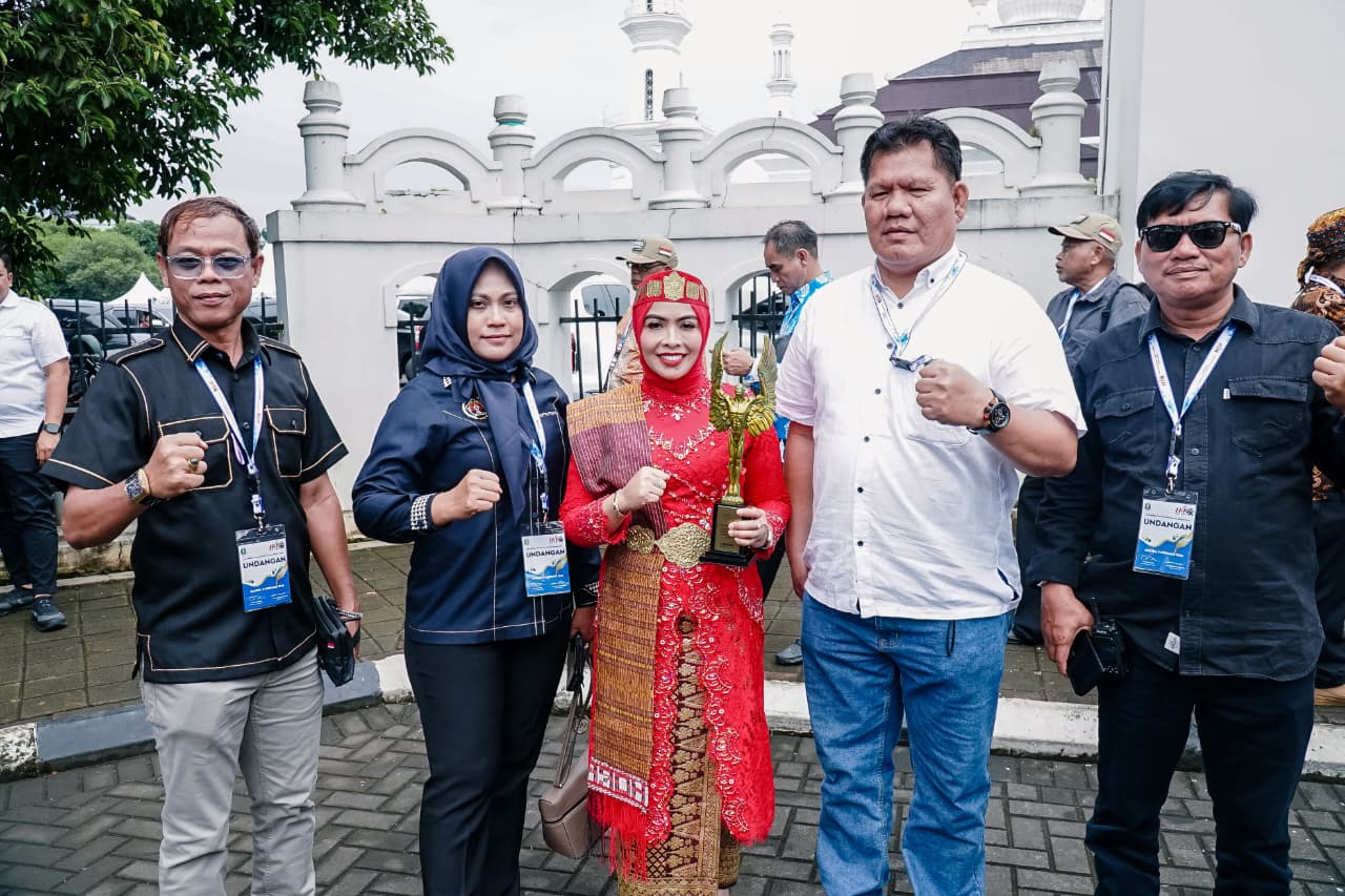 Bupati Labuhanbatu dengan mengenakan busana anggun berwarna merah cerah tampil cantik saat menerima piagam penghargaan. Senyum bahagia bisa masuk 10 besar merupakan memiliki nilai tersendiri.
