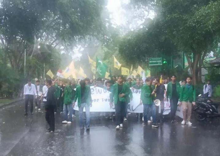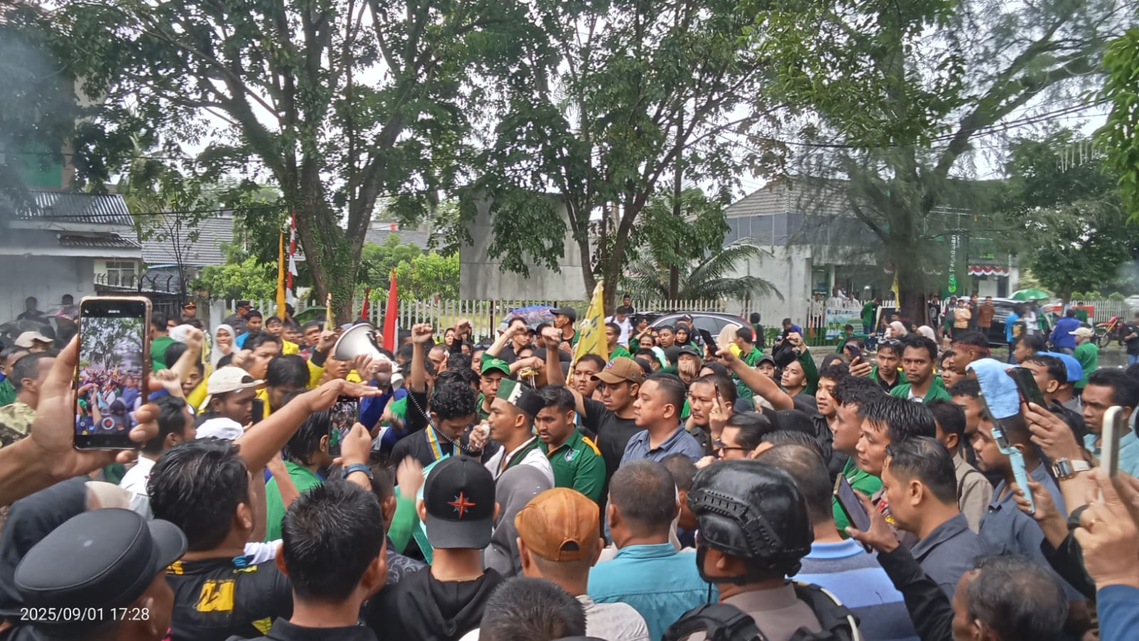 LANGSA (Waspada.id): Ratusan mahasiswa mengatasnamakan Aliansi Mahasiswa Kota Langsa, Senin (1/9) melakukan aksi unjuk rasa menuntut dilakukannya evaluasi terhadap Polri dan pembubarkan DPR meski diterpa hujan disertai angin kencang di gedung DPRK dan Mapolres Langsa.