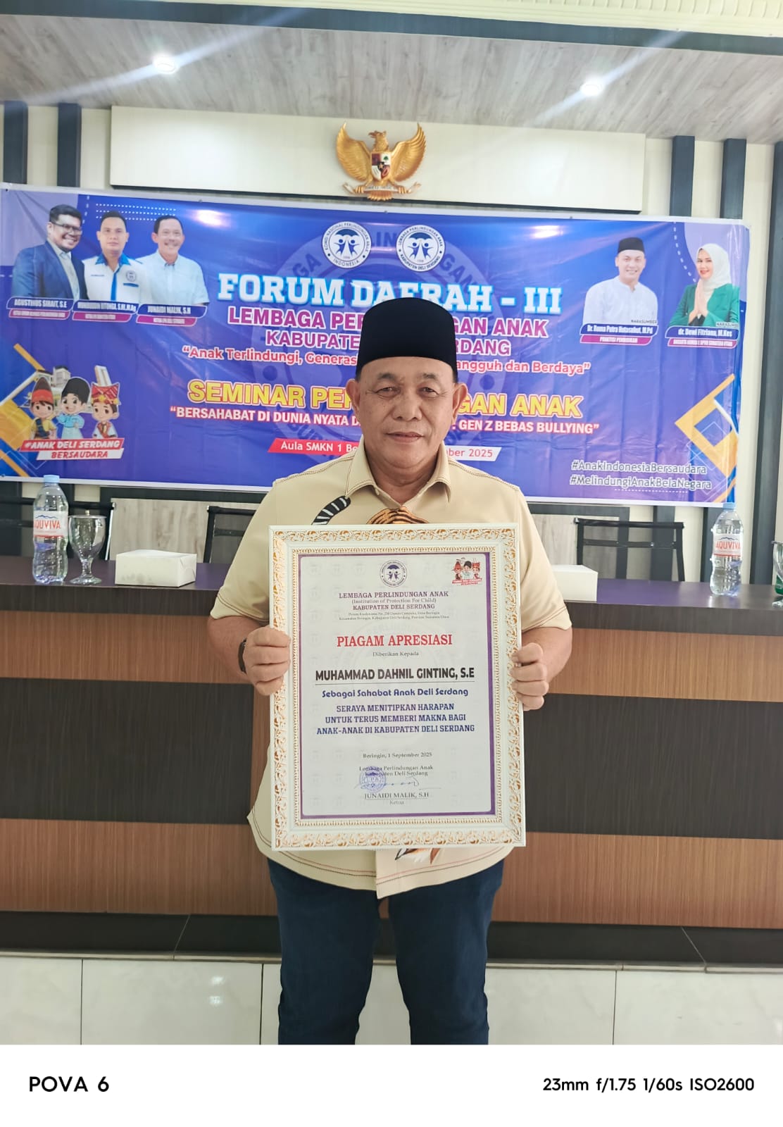 DELISERDANG (Waspada.id): Anggota DPRD Deliserdang dari Fraksi Gerindra Muhammad Dahnil Ginting,SE mendapatkan piagam penghargaan dari Lembaga Perlindungan Anak Kabupaten Deliserdang, Senin (1/9/2025).