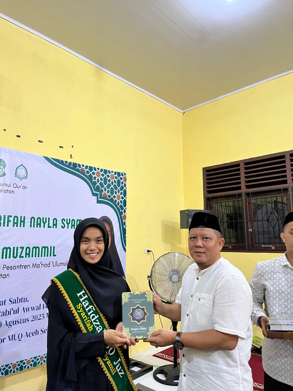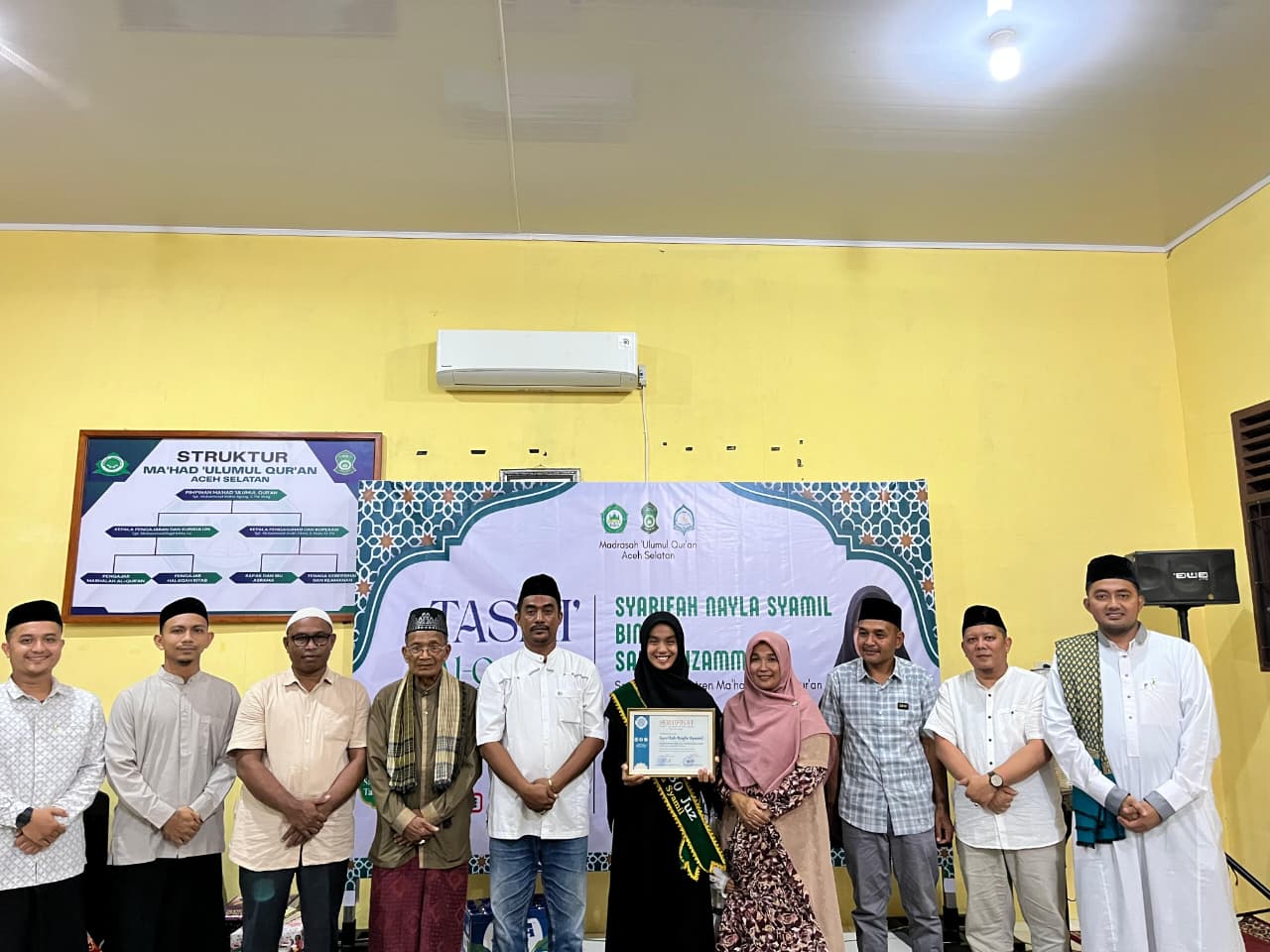 Acara Tasmi’ Bil Ghaib, yang bertujuan meningkatkan kualitas hafalan santri, dilaksanakan secara bertahap mulai dari 5 juz, 15 juz, hingga 30 juz. Syarifah Nayla Syamil, santriwati asal Kecamatan Bakongan, berhasil menyelesaikan setoran 30 juz pada acara yang turut dihadiri oleh Plt. Sekda Aceh Selatan Dr. Masrizal SE, M.Si, Ketua MPU Abon H.T Armia Ahmad, dan kedua orang tua santriwati.