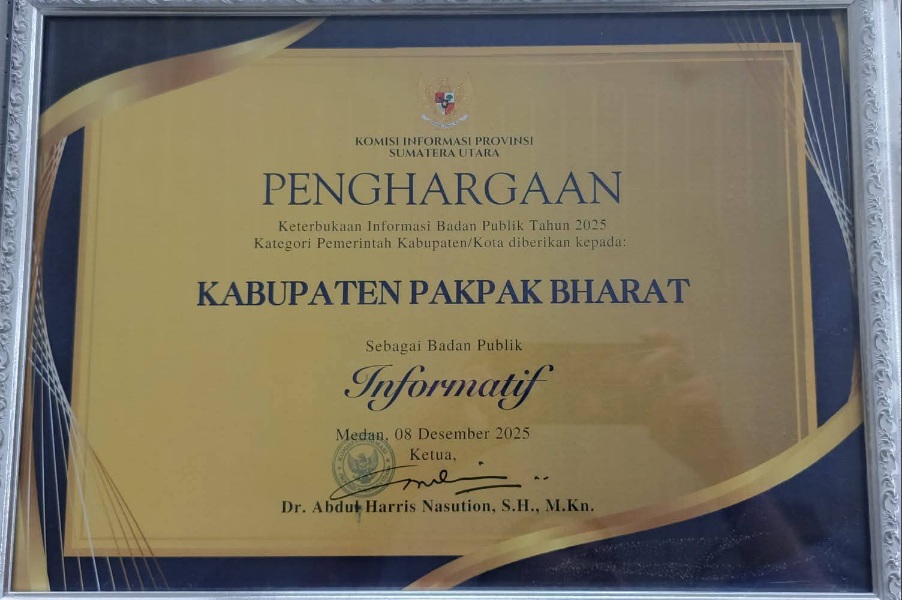 MEDAN (Waspada.id): Pemerintah Kabupaten Pakpak Bharat meraih Anugerah Kabupaten Informatif pada ajang KIP Sumut Award 2025. Penghargaan diserahkan di Gedung Komisi Informasi Provinsi Sumatera Utara, Medan, Kamis (18/12/2025).