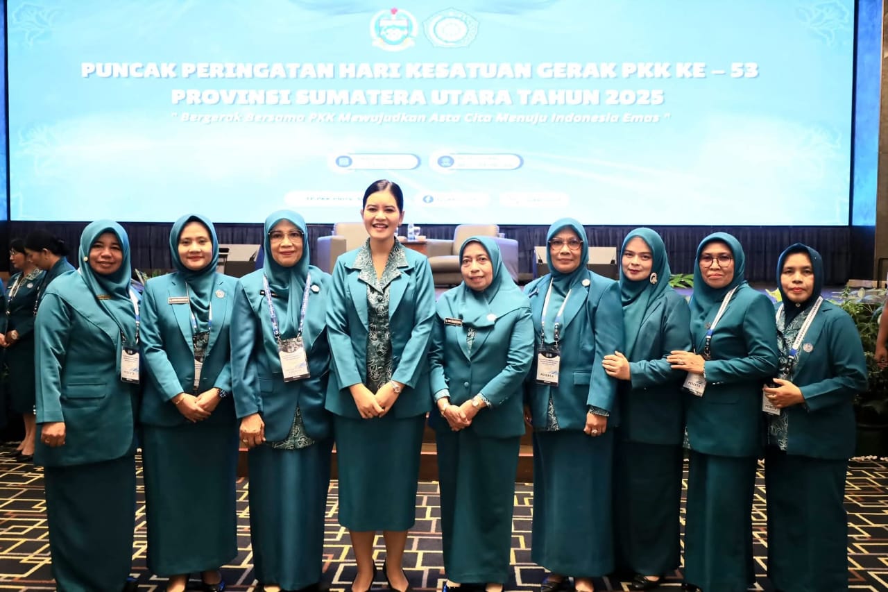 MADINA (Waspada): Ketua Tim Penggerak Pemberdayaan dan Kesejahteraan Keluarga (PKK) Kabupaten Mandailing Natal (Madina) Ny. Yupri Astuti bersama dengan pengurus menghadiri peringatan Hari Kesatuan Gerak (HKG) PKK ke-53 di Hotel Grand Mercure, Medan, Selasa (12/8/25).