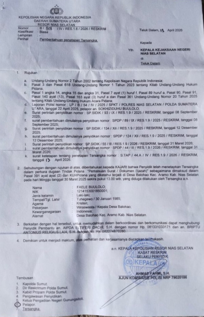 Penetapan oknum kades tersebut tertuang dalam surat resmi Kepolisian Resor Nias Selatan yang telah disampaikan kepada pihak pelapor.