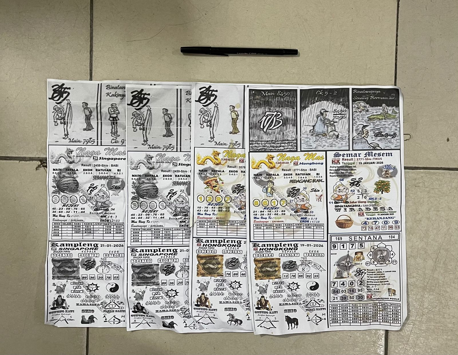 Selembaran kertas kode yang ikut diamankan Satreskrim Polres Sergai.Dari tangan pelaku, polisi mengamankan uang tunai Rp55 ribu, satu unit telepon genggam Android berisi data pembelian nomor tebakan, empat lembar kertas kode nomor, serta satu buah pulpen. Pelaku langsung digelandang ke Mapolres Sergai untuk pemeriksaan.