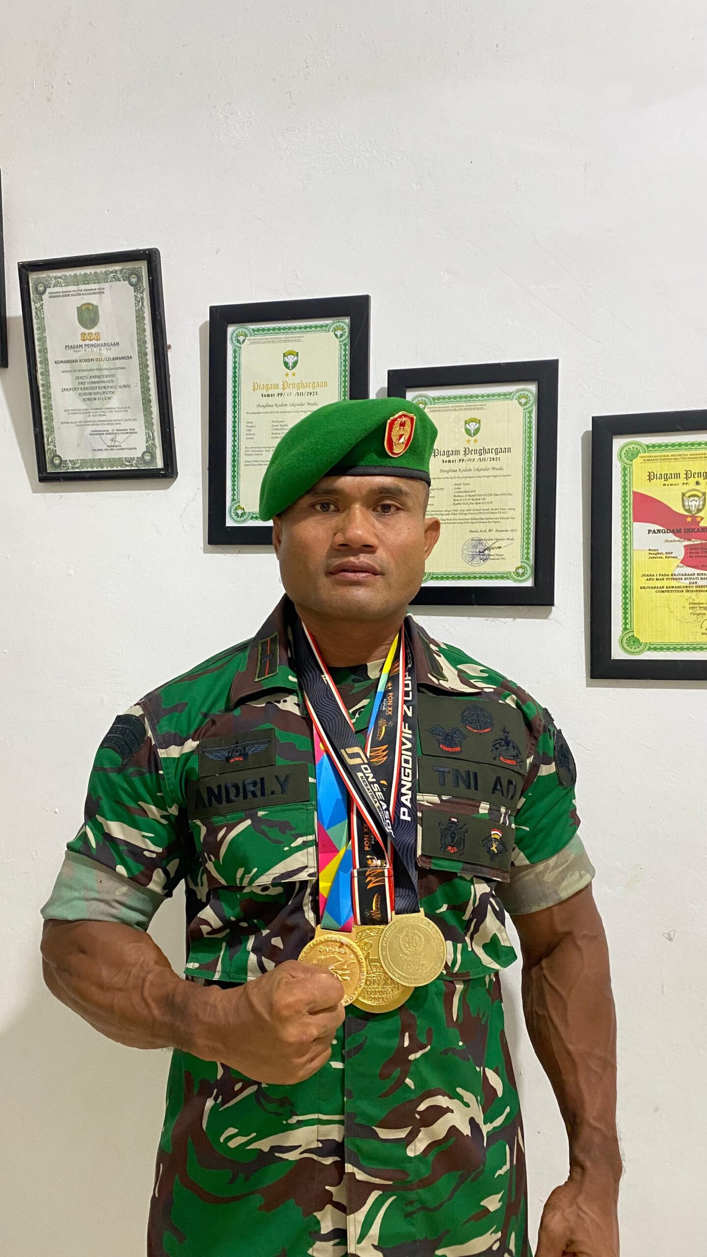 “Alhamdulillah, target emas untuk Indonesia terwujud. Selain latihan keras, dukungan dari Danrem 011/Lilawangsa Kolonel Inf Ali Imran, serta doa istri dan anak-anak menjadi motivasi terbesar saya,” ungkap Andri dengan rasa haru.