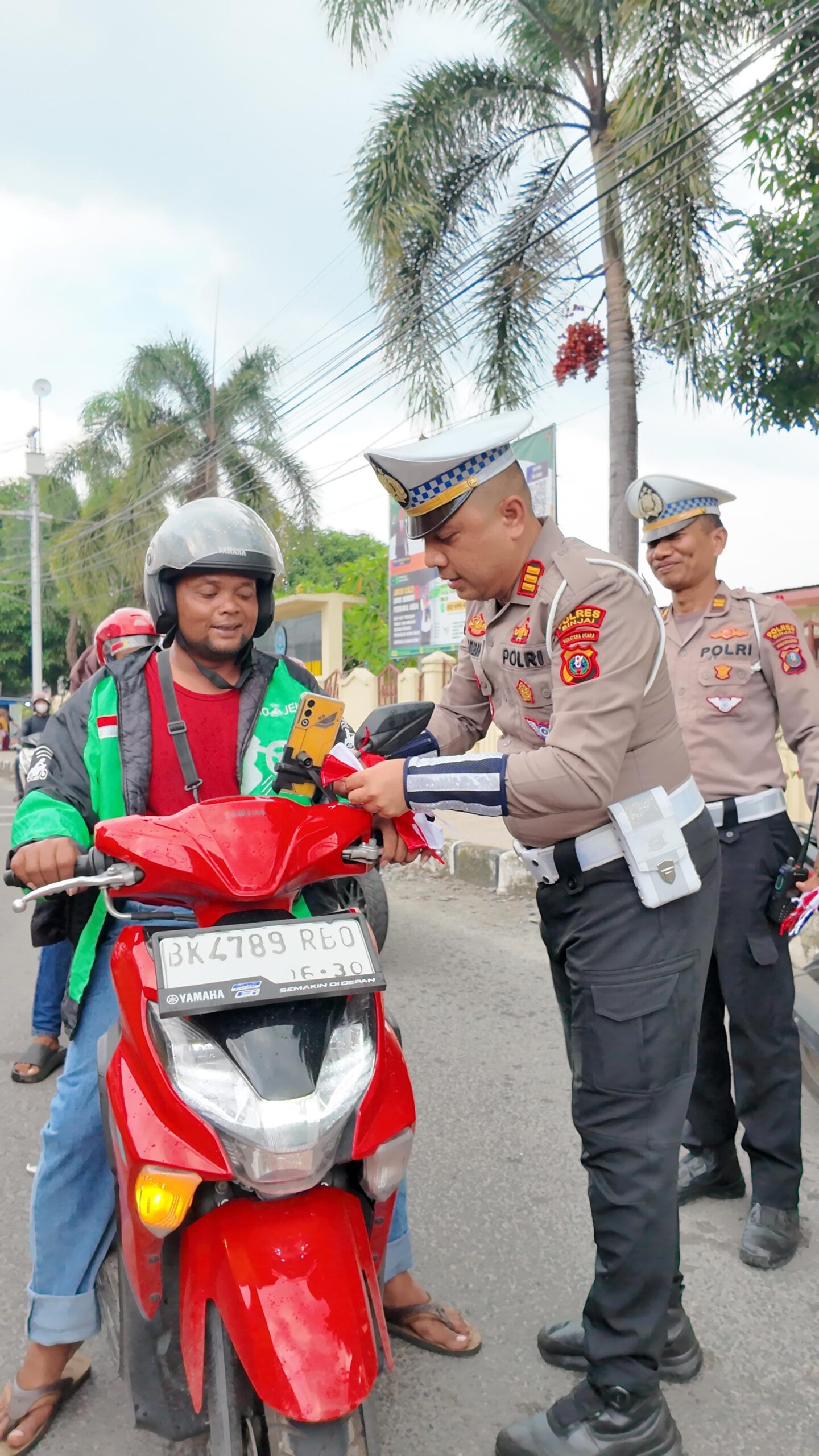 BINJAI (Waspada.id): Kapolres Binjai AKBP Bambang C. Utomo, S.H., S.I.K., M.Si., bagikan Bendera Merah Putih kepada pengemudi mobil maupun pengguna jalan lainnya yang sedang melintas.
