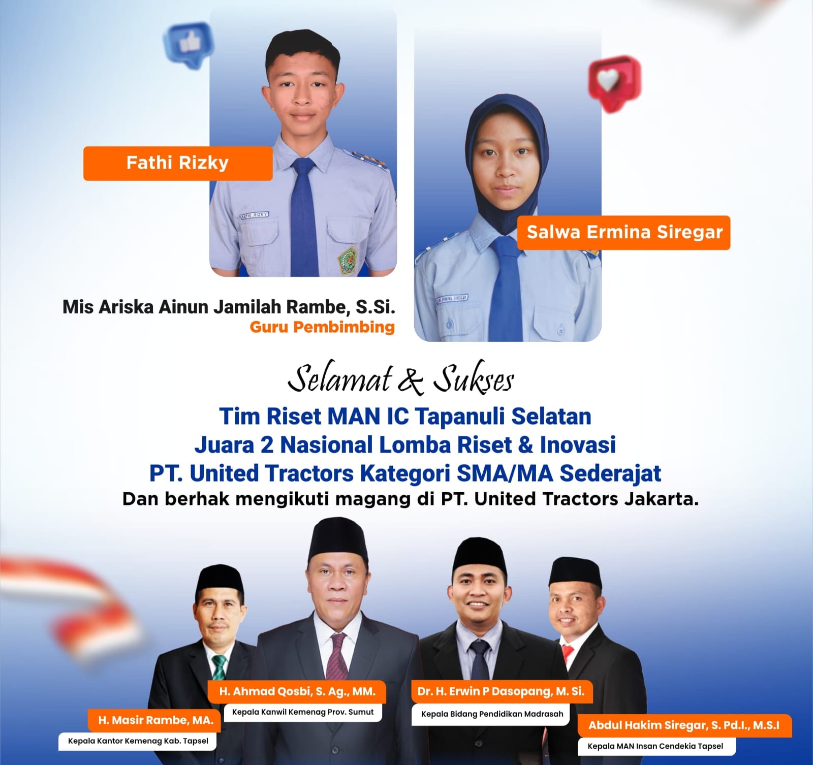 “Tim Riset MAN IC Tapsel yang terdiri dari Fathi Rizky dan Salwa Ermina Siregar, dengan pembimbing Mis Ariska Ainun Jamila Rambe, S.Si, berhasil meraih Juara 2 Nasional setelah melalui proses kompetisi yang ketat dan menantang,” tuturnya.