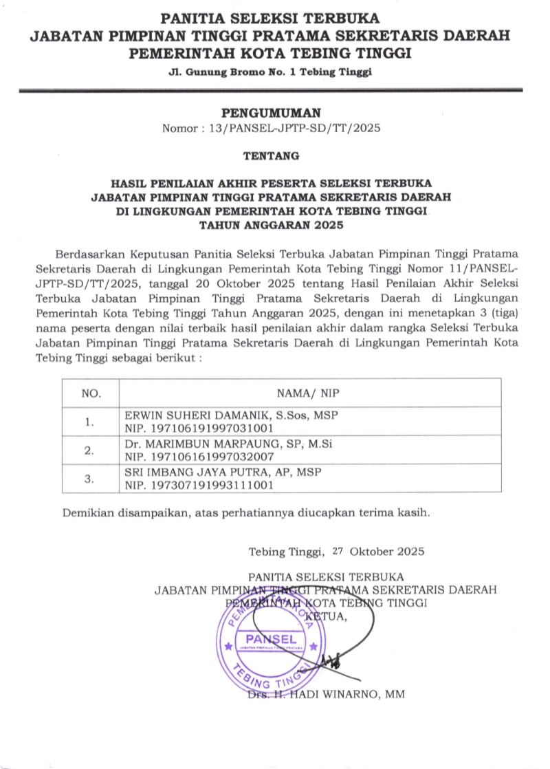 Kepala BKPSDM Abdul Halim Purba, baru-baru ini, saat dihubungi menyatakan SKP Sekda terpilih sudah ditandatangani mantan Pj. Wali Kota. “Berkas yang ada sama kami sudah diteken bang,” ujar Halim.
