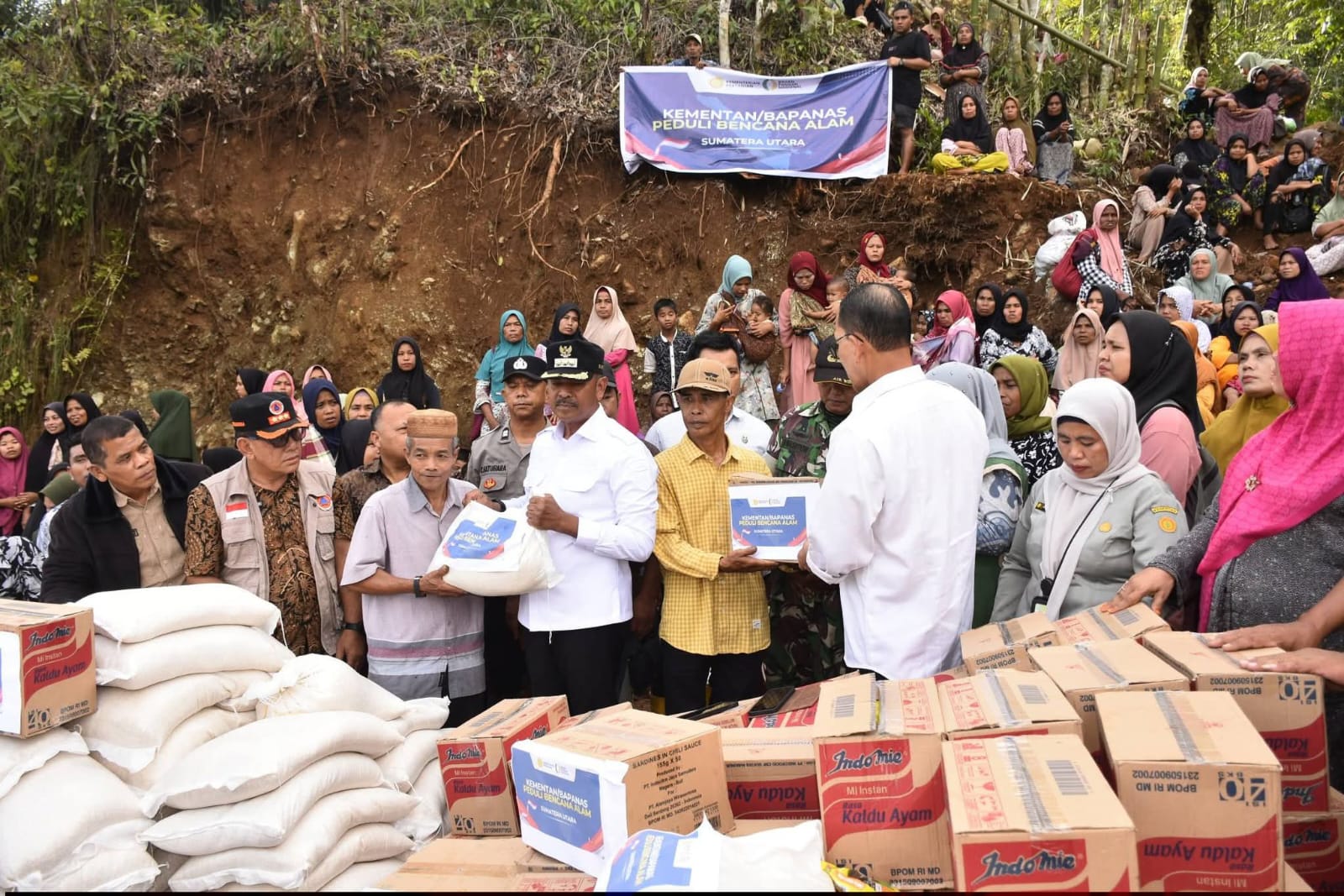 “Hari ini masyarakat datang berkumpul untuk menjemput bantuan ini karena kendaraan tidak bisa masuk, bantuan akan dipikul langsung oleh warga ke rumah masing-masing. Atas nama Pemerintah Kabupaten dan masyarakat, kami mengucapkan ribuan terima kasih. Semoga bantuan ini menjadi berkah bagi kita semua,” sebut dia.