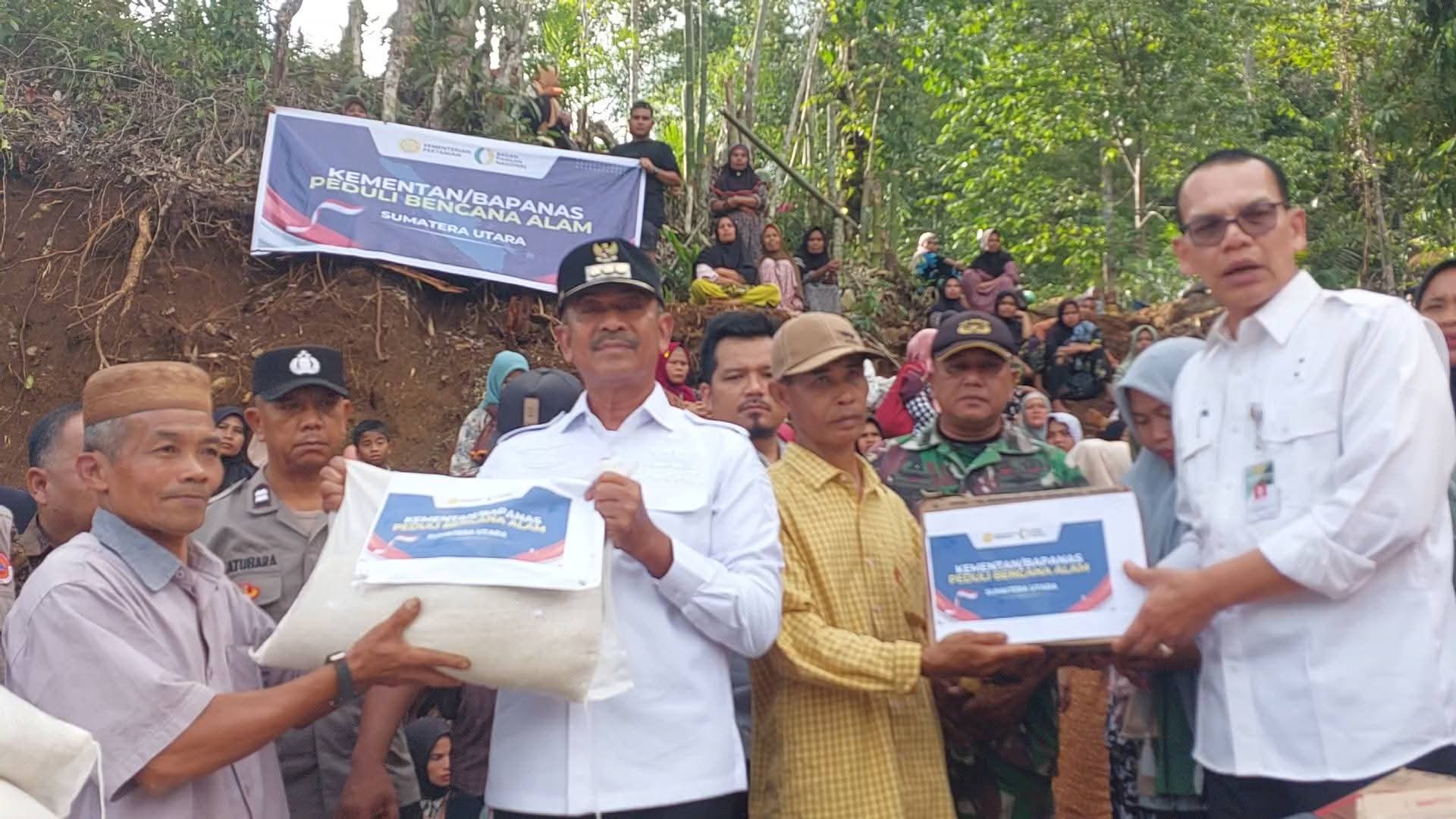 BATANG NATAL (Waspada.id): Bupati Mandailing Natal (Madina) H. Saipullah Nasution bersama Staf Ahli Kementerian Pertanian Ali Jamil Harahap menyalurkan bantuan sembako kepada warga terisolasi di Desa Banjar Malayu, Kecamatan Batang Natal, Kamis (18/12/25).