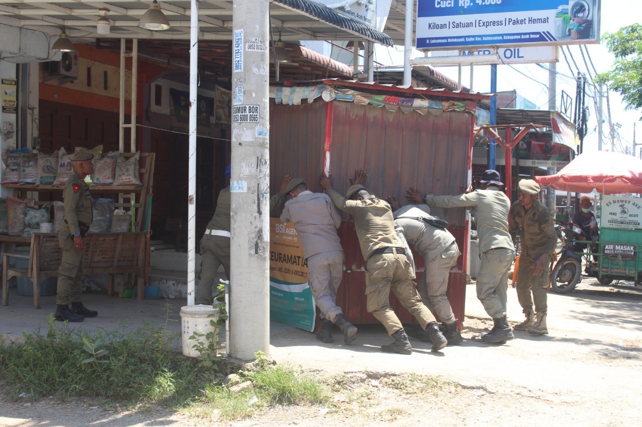 Kasatpol PP dan WH Aceh Besar, Muhajir mengatakan, penertiban dilakukan setelah pihaknya menemukan sejumlah lapak dan bangunan semi permanen yang berdiri di badan jalan serta di atas saluran irigasi.